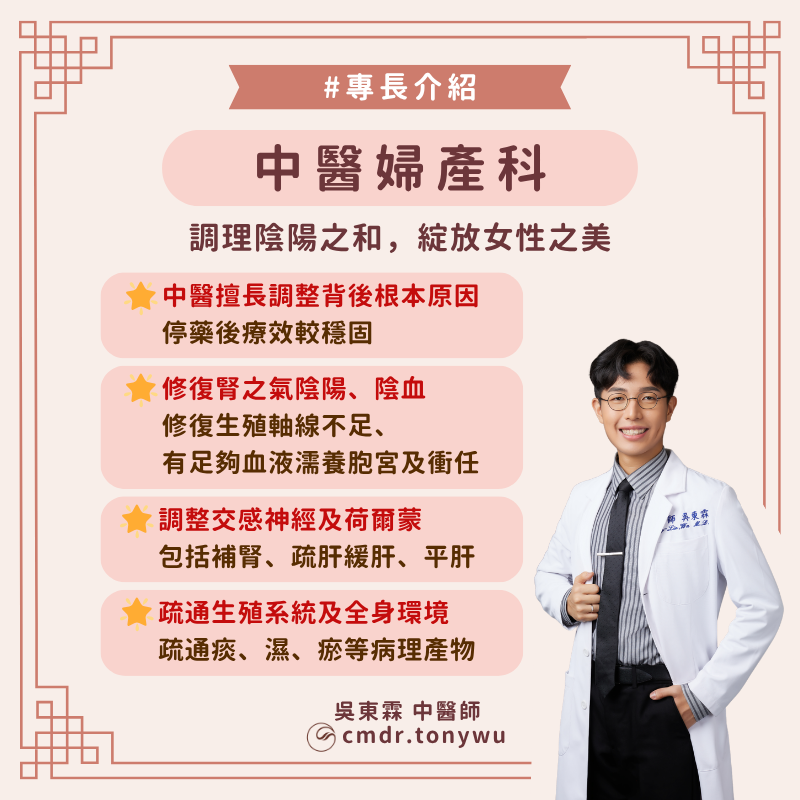 中醫治療婦產疾病擅長調整背後根本原因,包括①修復腎之氣陰陽+陰血②調整交感神經及荷爾蒙③疏通生殖系統及全身之體環境,停藥後療效較穩固